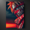 This cinematic, high-detail portrait offers a gritty and hyper-realistic reimagining of Naruto Uzumaki. The image captures the protagonist in a moment of quiet intensity, his face partially obscured by a weathered crimson mask and tactical gear. The composition draws immediate focus to his striking azure blue eye, which glows with a supernatural clarity against the dark, atmospheric background.
